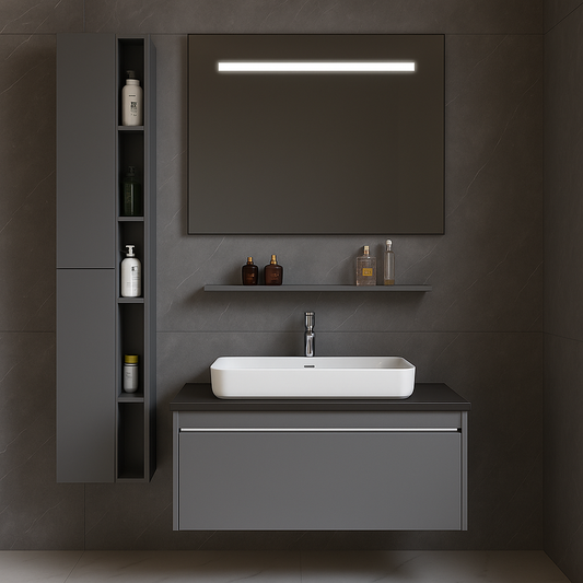 Moderný kúpeľňový nábytok s minimalistickým a funkčným dizajnom. Sady so zavesenými skrinkami, zrkadlom a umývadlom, ktoré sú k dispozícii v rôznych rozmeroch. Mnohé modely zahŕňajú okolité LED LED a mäkké zásuvky, ktoré sú komplexné roztoky pre elegantnú a organizovanú kúpeľňu.