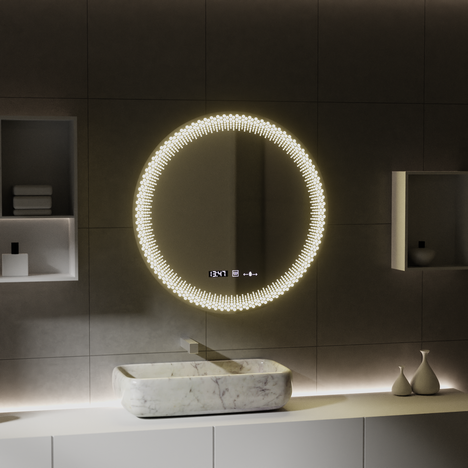 Pridajte do svojej kúpeľne do svojej kúpeľne poznámku o modernej elegancii a pokročilých technológiách s okrúhlym LED Stellaire Touch Mirror. Jeho dokonalý kruhový tvar s priemerom 60 cm vytvára harmonický ohnisko, zatiaľ čo inteligentné funkcie vám poskytujú pohodlie a kontrolu.