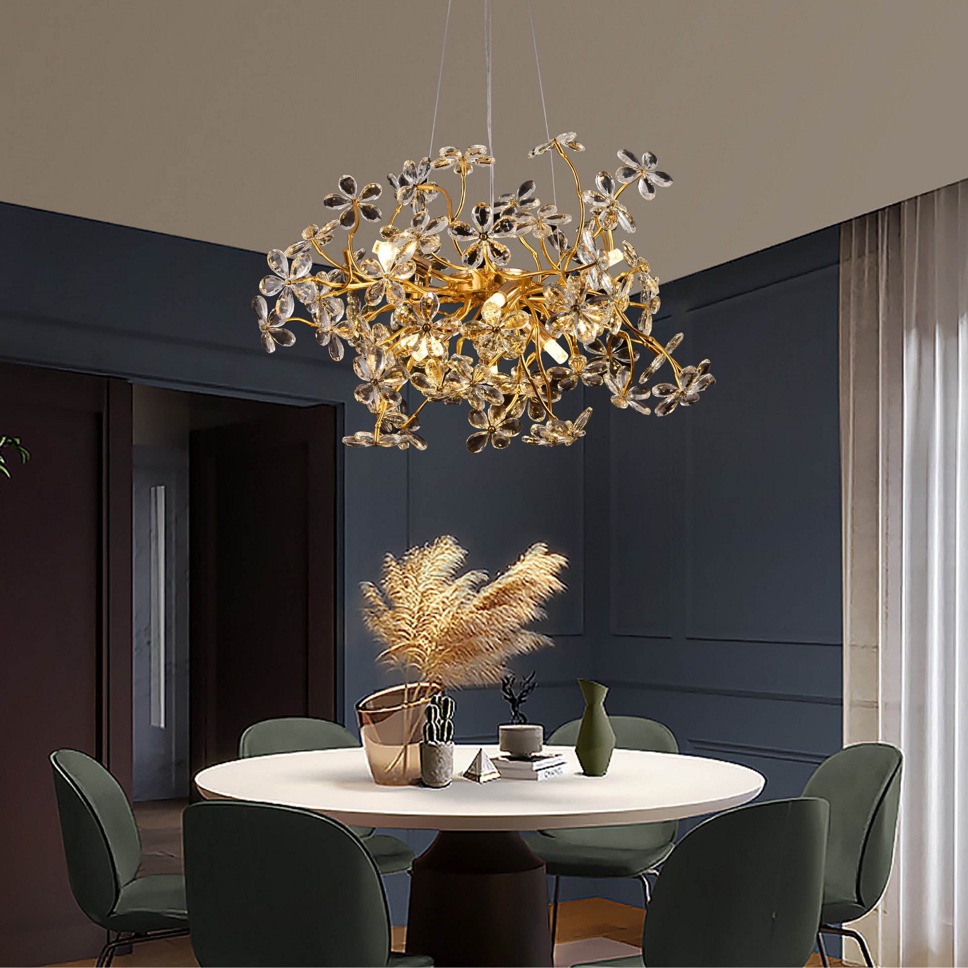 S priemerom 55 cm, chrómovým povrchom a krištáľovými dekoratívnymi prvkami vytvára luster veľkolepé odlesky a dodáva priestoru extra iskru. Nastaviteľná výška umožňuje jednoduché prispôsobenie rôznym typom stropov, čím sa CM325/600GD zmení na elegantné a dobre proporčné ohnisko.