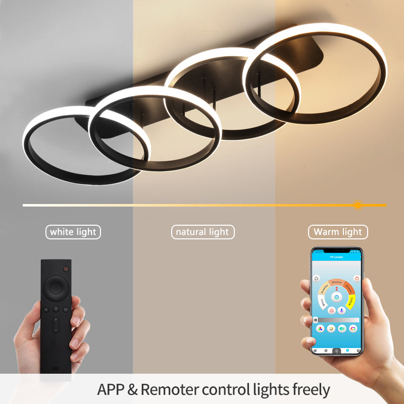 Štyri čierne kruhy, pravdepodobne rôznych veľkostí alebo usporiadané esteticky, sú osvetlené LED diódami. S výkonom 24W je vhodný na osvetlenie menších alebo stredných priestorov, ako sú spálne, kancelárie alebo chodby. Čierna povrchová úprava mu dodáva elegantný vzhľad a ľahko sa integruje do rôznych moderných dekorov.