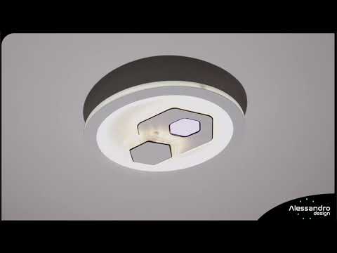 Elegantný dizajn kombinuje kruhový tvar so šesťhrannými prvkami, z ktorých jeden má dekoratívne fialové svetlo. S kompaktnými rozmermi 20x20 cm a tenkým profilom 4 cm sa luster KATHLEEN perfektne začlení do moderných priestorov.