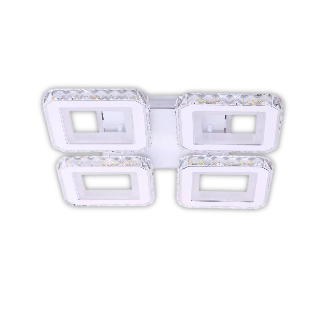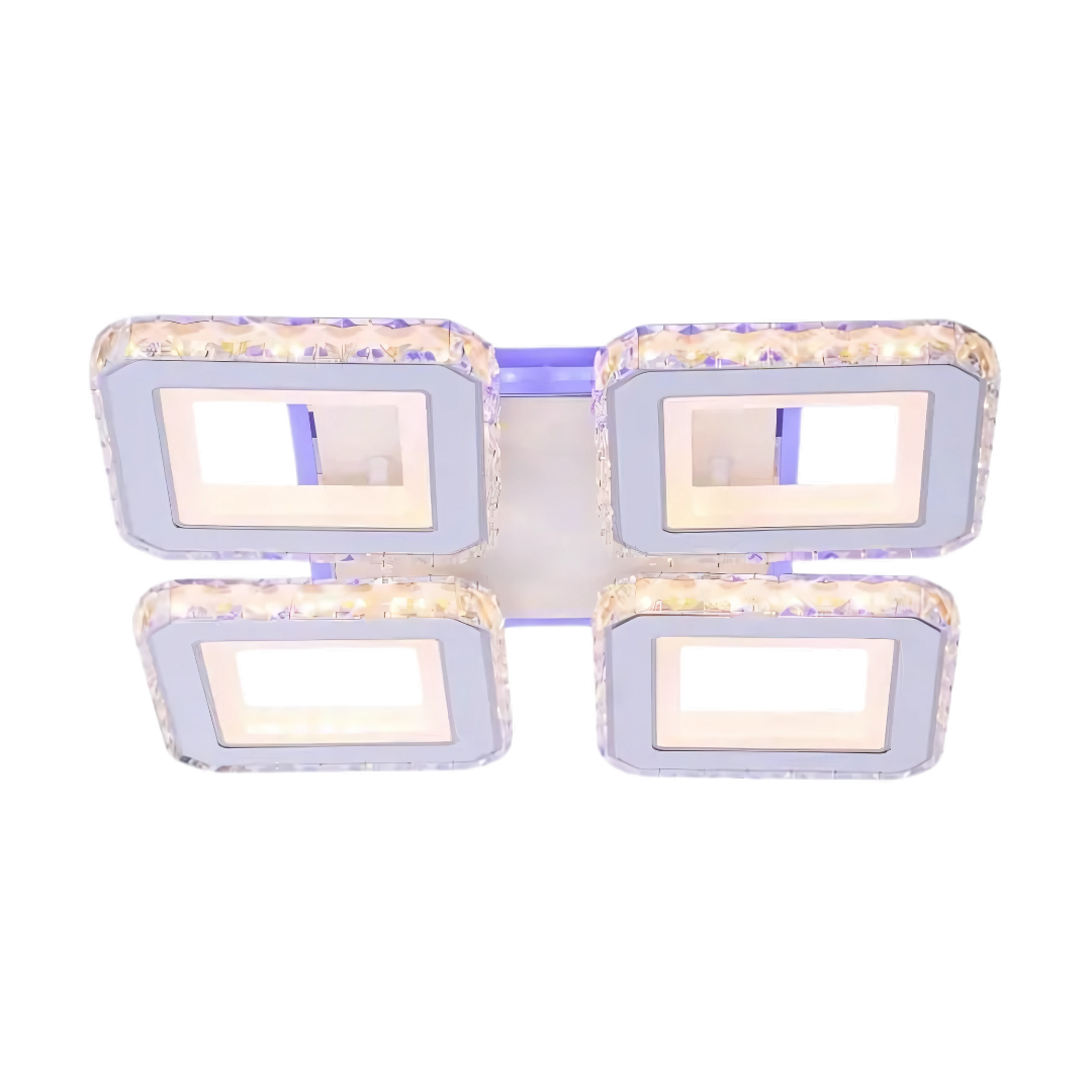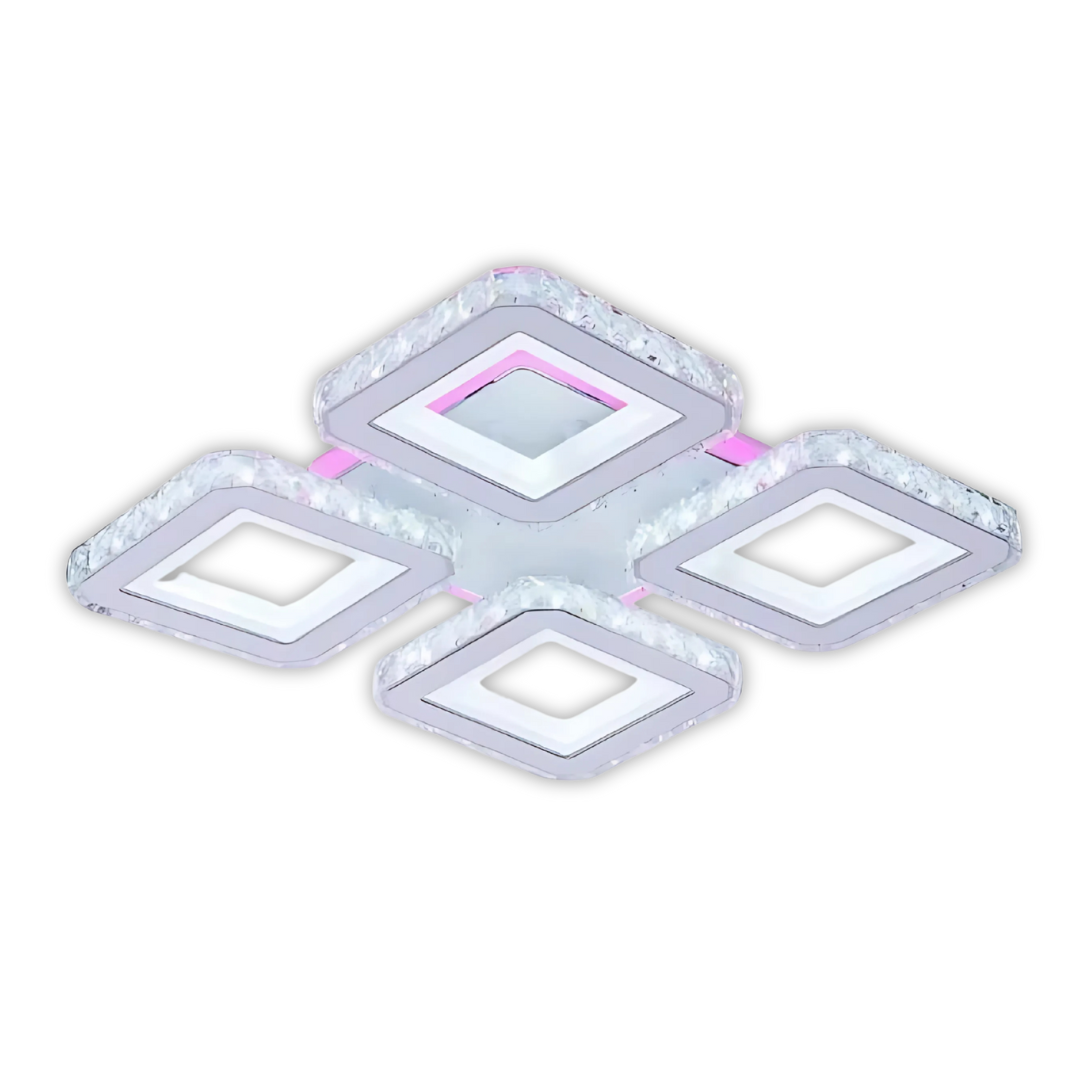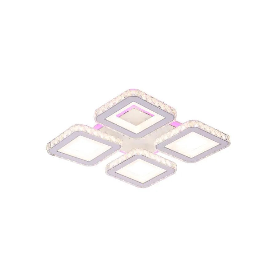 LED luster s diaľkovým ovládaním a krištáľom LEILA RGB 79W, 4 štvorce, studené/teplé/neutrálne svetlo, stmievateľné, lesklá chrómová biela