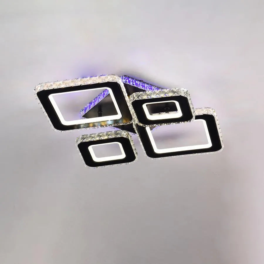 Štyri čierne štvorce zdobené kryštálmi vytvárajú elegantný a sofistikovaný geometrický vzhľad. Kryštály budú odrážať a lámať integrované LED svetlo, čím vytvárajú iskrivý efekt a luxusnú atmosféru. Dodávané diaľkové ovládanie vám umožňuje ovládať nielen teplotu farieb (studená, teplá alebo neutrálna) a intenzitu svetla (stmievateľné), ale aj funkciu RGB, ktorá vám umožňuje vybrať si zo širokej škály farieb na vytvorenie dynamických a personalizovaných svetelných efektov.