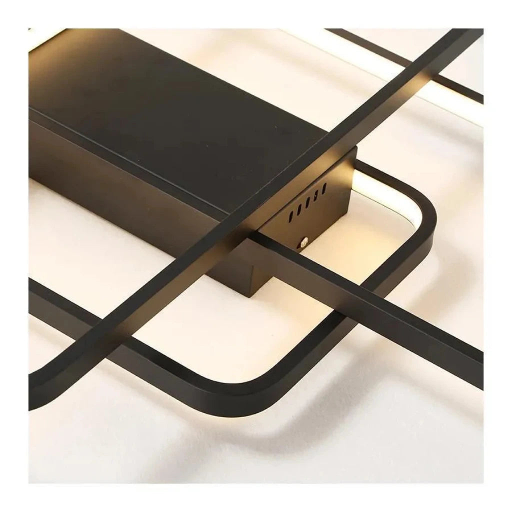 Objavte umelecký geometrický dizajn zložený z troch vzájomne prepojených obdĺžnikov, ktoré premieňajú tento luster na skutočné dielo súčasného umenia. Matný čierny povrch ponúka sofistikovaný kontrast s teplým svetlom a vytvára dramatický akcent v interiérovom dizajne každej modernej miestnosti.