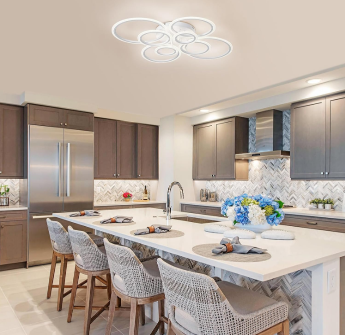 Každý kruh sa integruje vysoko kvalitné LED pásy, ktorá rozdeľuje svetlo rovnomerne a pohodlne, bez tmavých plôch. S celkovým výkonom 130 W a pôsobivý svetelný tok 10 400 lm, BETTY je ideálna pre priestranné obývacie izby, veľké spálne, kancelárie alebo otvorené priestory.