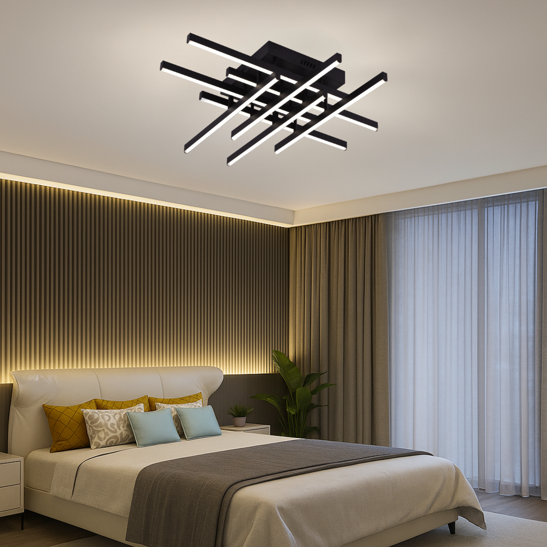 LED luster na diaľkové ovládanie LINEX, model s 8 ramenami, má výkon o 90 W a svetelný tok 7200 lm, poskytujúce svetlo Stmievateľné s voliteľnými teplotami: 3000K, 4000K, 6000K (teplý, neutrálny, studený). Funguje pri 220–230 V, s autonómiou 25 000 hodína je ovládaná spoločnosťou diaľkové ovládanie alebo klasický vypínač. Má dizajn lineárne, montáž aplikovaný na strop, vyrobený z kov a akryl, dokončiť čierna. Rozmery: 62 cm dlhé, 23 cm široký, 13 cm vysoký. Ochrana IP20, jedlo do siete. Odporúčané pre spálňa, obývačka alebo hala.