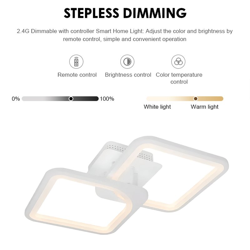 LED luster s diaľkovým ovládaním ZOE je moderný a efektívny kus osvetlenia s dizajnom zloženým z dvoch štvorcov o sile 69 W a biely povrch. Dodávané diaľkové ovládanie poskytuje ovládanie teploty farieb a intenzity svetla.