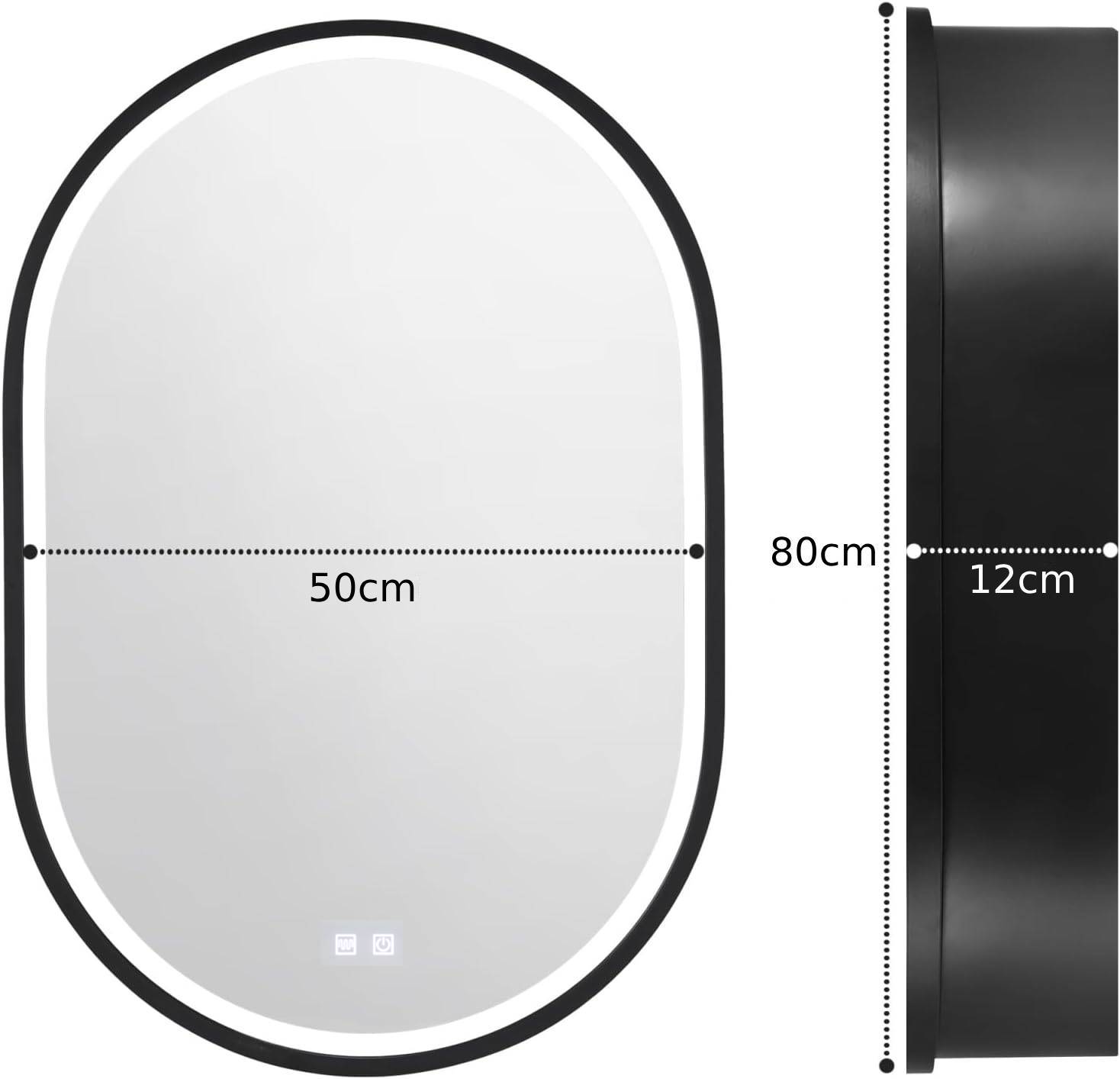 LED zrkadlo so skrinkou, oválne, 50x80 cm, odhmlievanie, studené/teplé/neutrálne svetlo, čierny rám, úložný priestor