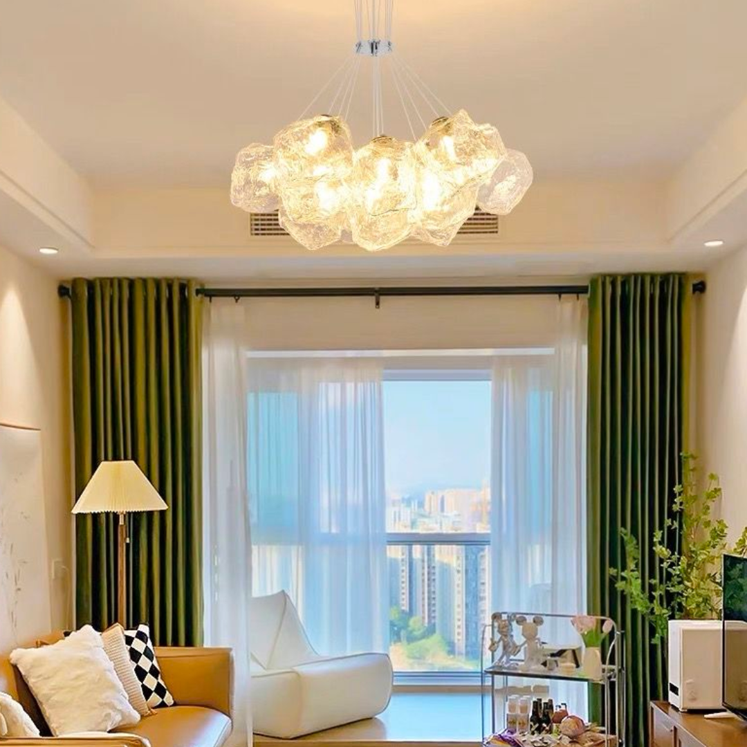 Toto luster so žiarovkou je vybavená 13 zásuvkami E27, je ideálny pre veľké miestnosti, ako sú obývacie izby alebo priestranné spálne. Závesný dizajn s priehľadnými sklenenými glóbusmi vytvára vzdušný vizuálny efekt a zaisťuje rovnomerné rozloženie svetla.