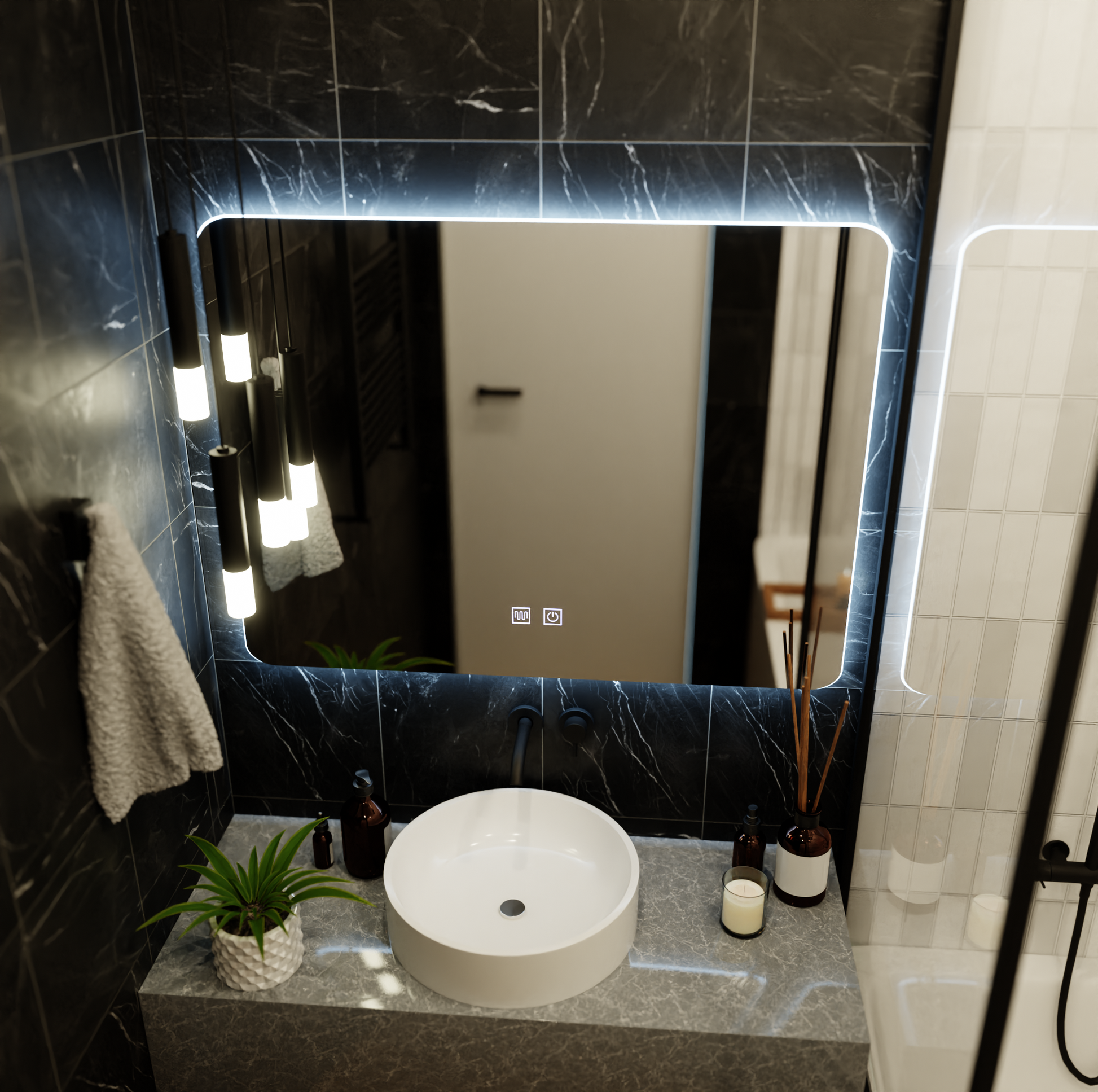 LED osvetlenie 6000K (studené svetlo) poskytuje vynikajúcu čistotu pri líčení, holení alebo každodenných rutinách a funkciu stmievateľné umožňuje nastaviť intenzitu svetla podľa prostredia a preferencií. Ovládanie je jednoduché a intuitívne dotykový panel, elegantne integrovaný do zrkadlového povrchu.