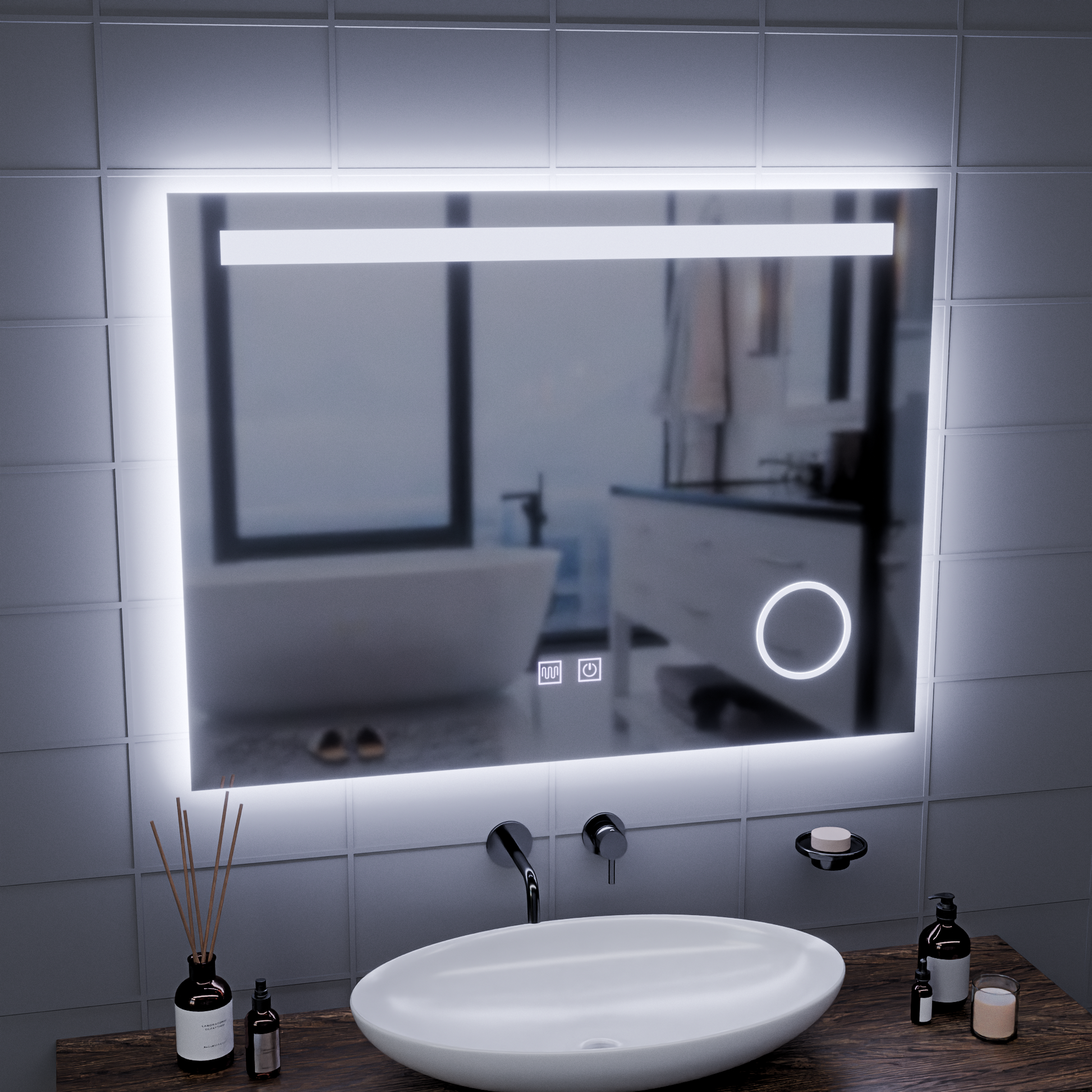 Obdĺžnikové LED zrkadlo, 80x60cm, Piano Touch, Demist System, Stmievateľné, Studené svetlo 6000K