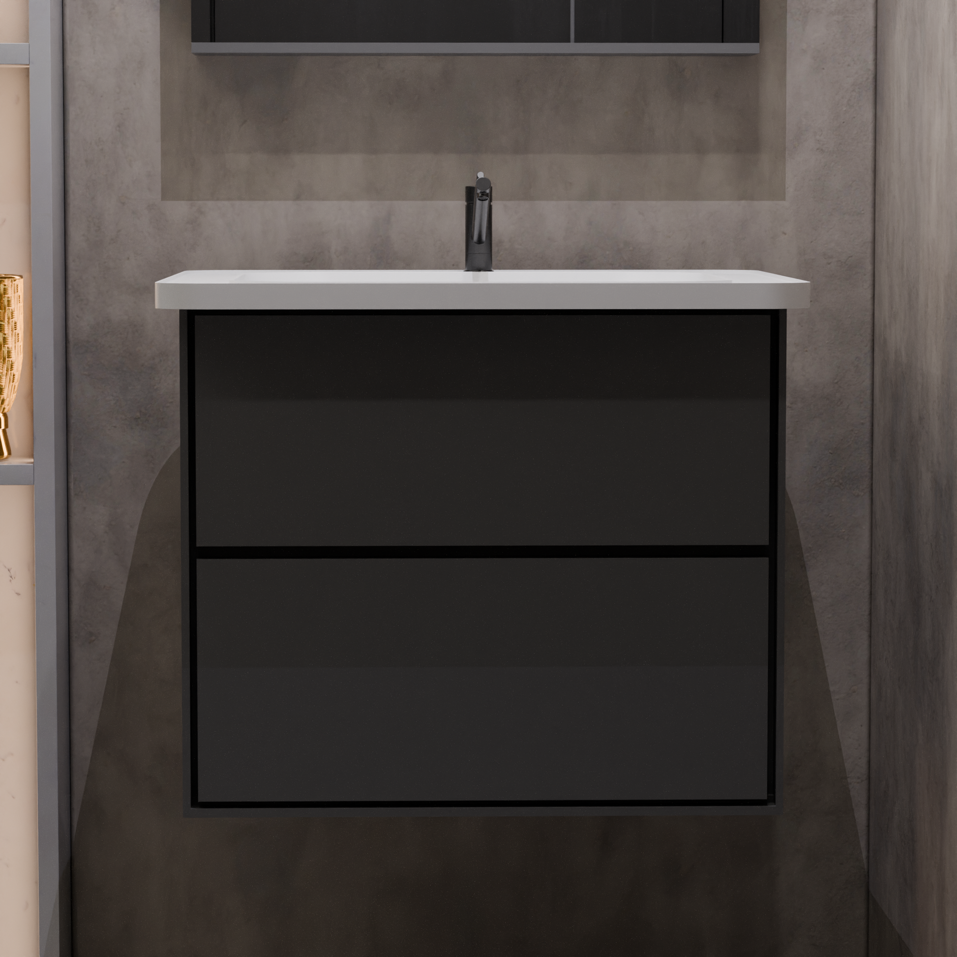 Spodná časť tela (nábytok s umývadlom): Základný nábytok je tiež zavesený, čo umožňuje jednoduché čistenie podlahy. Má zásuvky na uloženie a integruje umývadlo priamo do dosky. Prevedenie s liatym umývadlom vytvára súvislú plochu bez škár, ľahko sa udržiava a má moderný vzhľad.