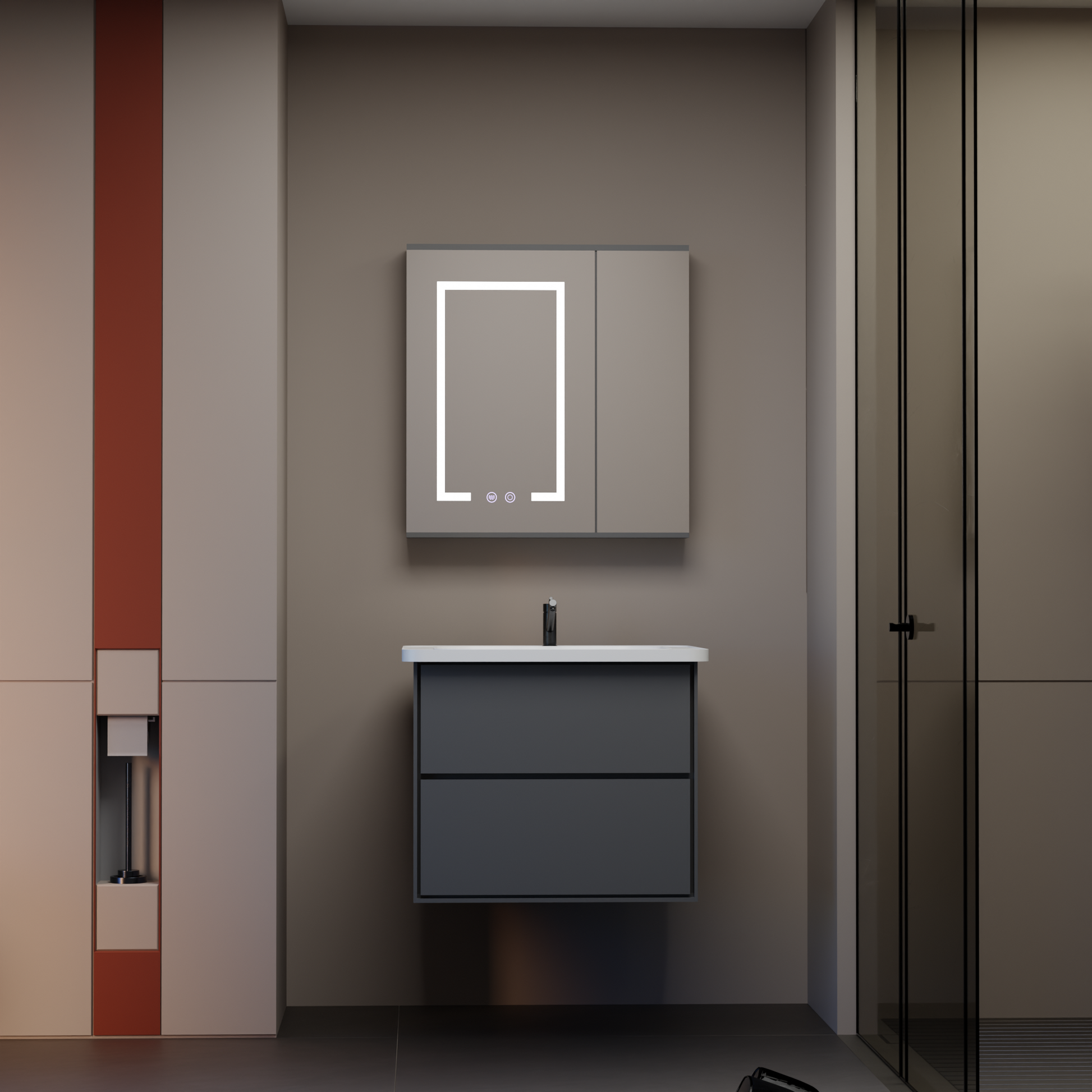 Horná časť tela (nábytok so zrkadlom LED): Ide o závesnú skrinku, ktorej súčasťou je zrkadlo na prednej strane. Systém LED osvetlenia je integrovaný na obryse zrkadla a premieta svetlo von, čím prispieva k celkovej atmosfére kúpeľne. Za zrkadlom je úložný priestor na organizáciu kozmetiky a hygienických potrieb.