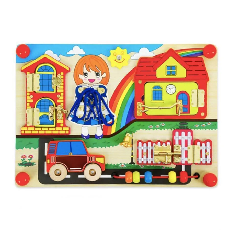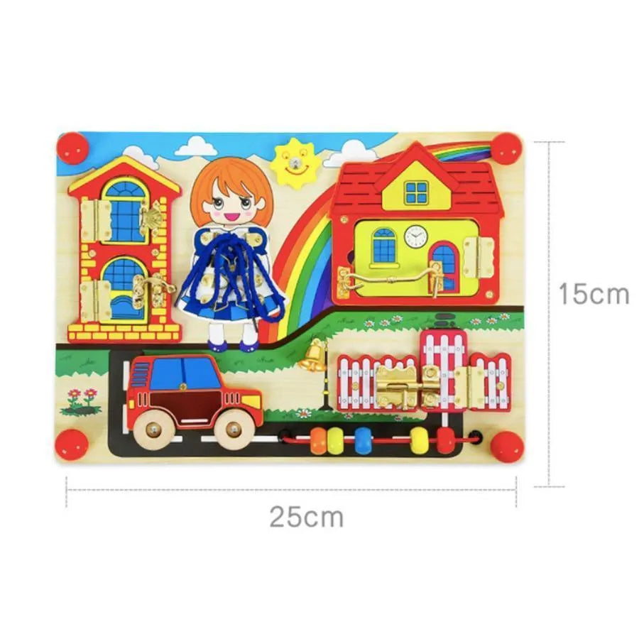 Typ hračky očarovaných, viacfarebných, drevených a kovových zámkov