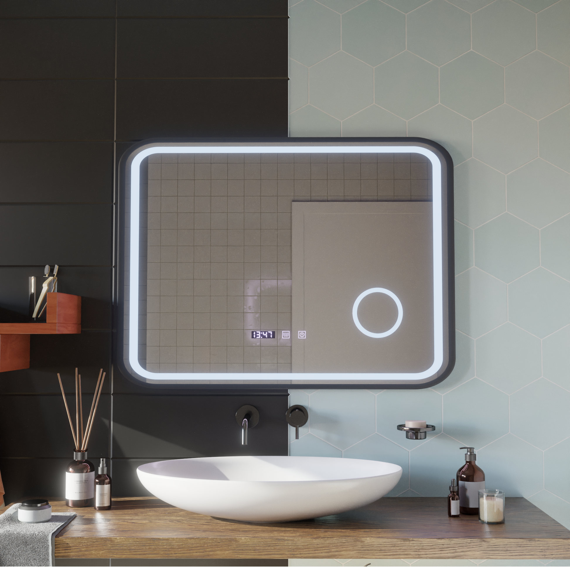 Zrkadlo LED Touch Bernd Defrosting Systém, hodiny a teplota 80x60 cm Black Brush Fund Cosmetica
