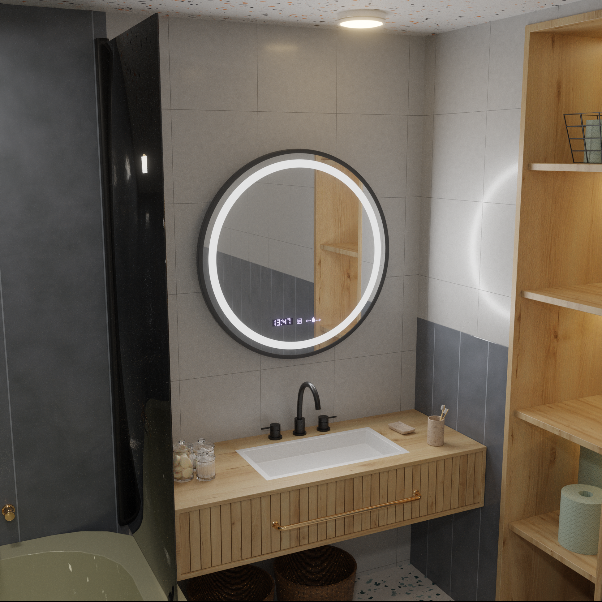 LED okrúhle zrkadlo, 80 cm, Celeste Majesté Noir MotionGlow Marcello, Demister System, Hodiny & Teplomer, Stmievateľné